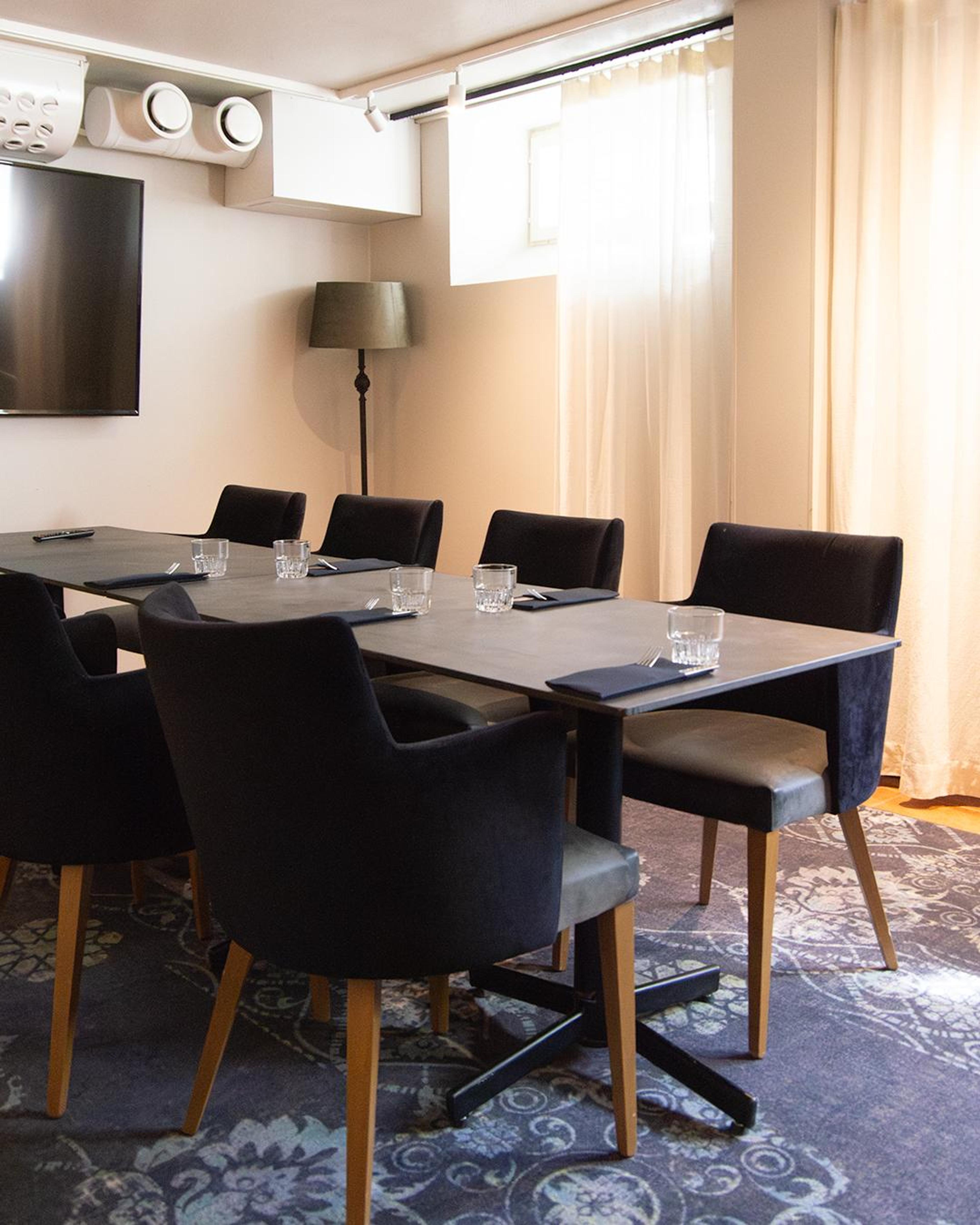 Saha -kabinetti on alakerrasta löytyvä, pienemmille porukoille soveltuva tila ruokailu-, juhla- tai kokouskäyttöön.