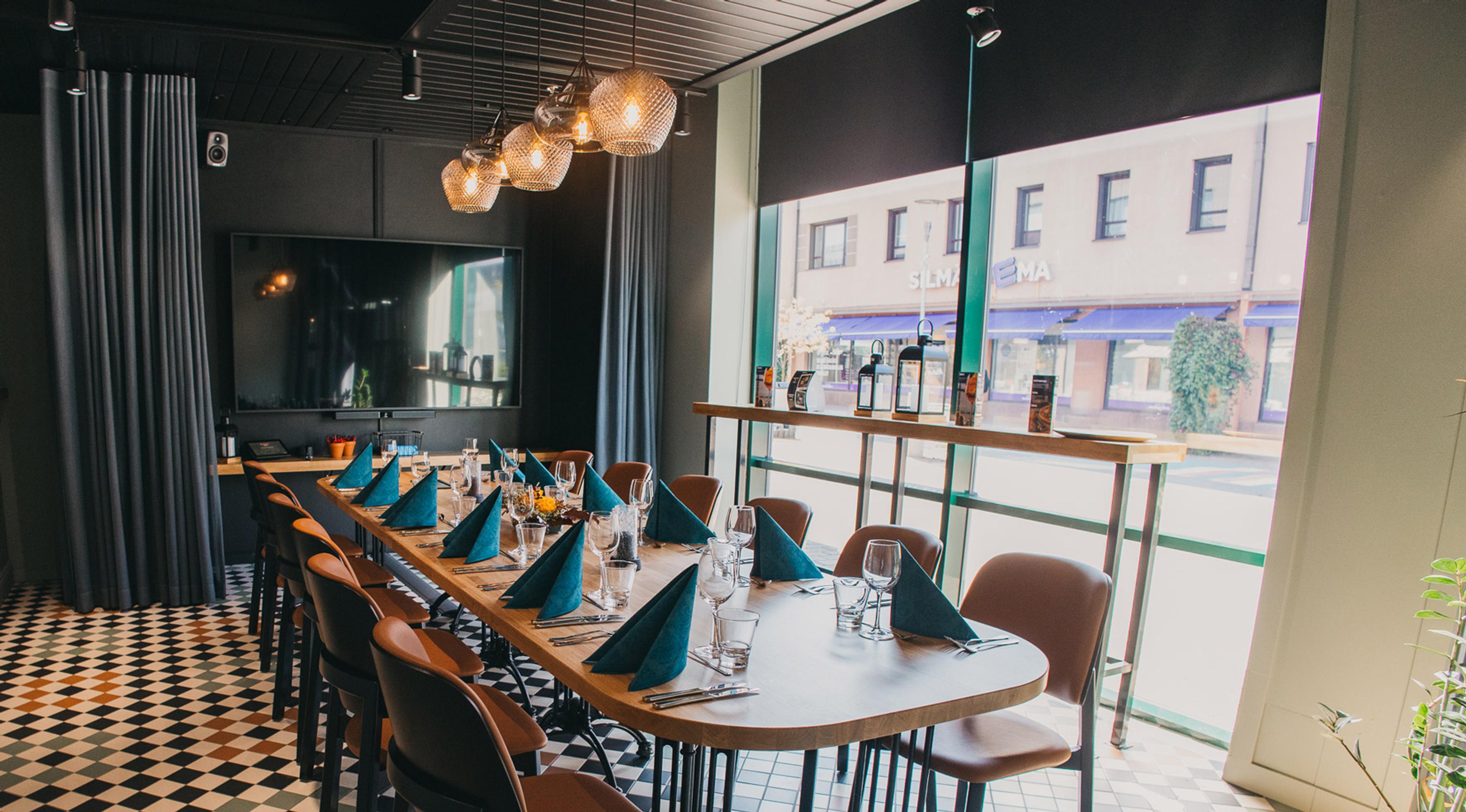Tilassa on yhtenäinen pöytä ja ajanmukainen kokoustekniikka. Tarjolla on Rosson ruoka- ja juomalista. Ruokailun yhteydessä emme peri tilasta erillistä tilavuokraa, min. 6 henkilön varaukset. Varattavissa maksimissaan 12 henkilölle.